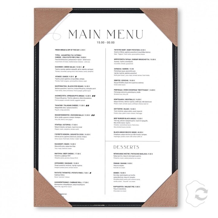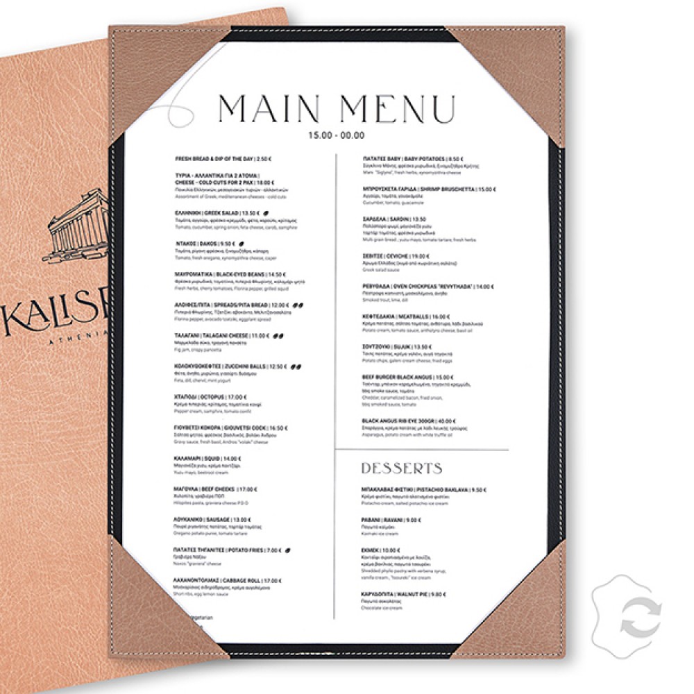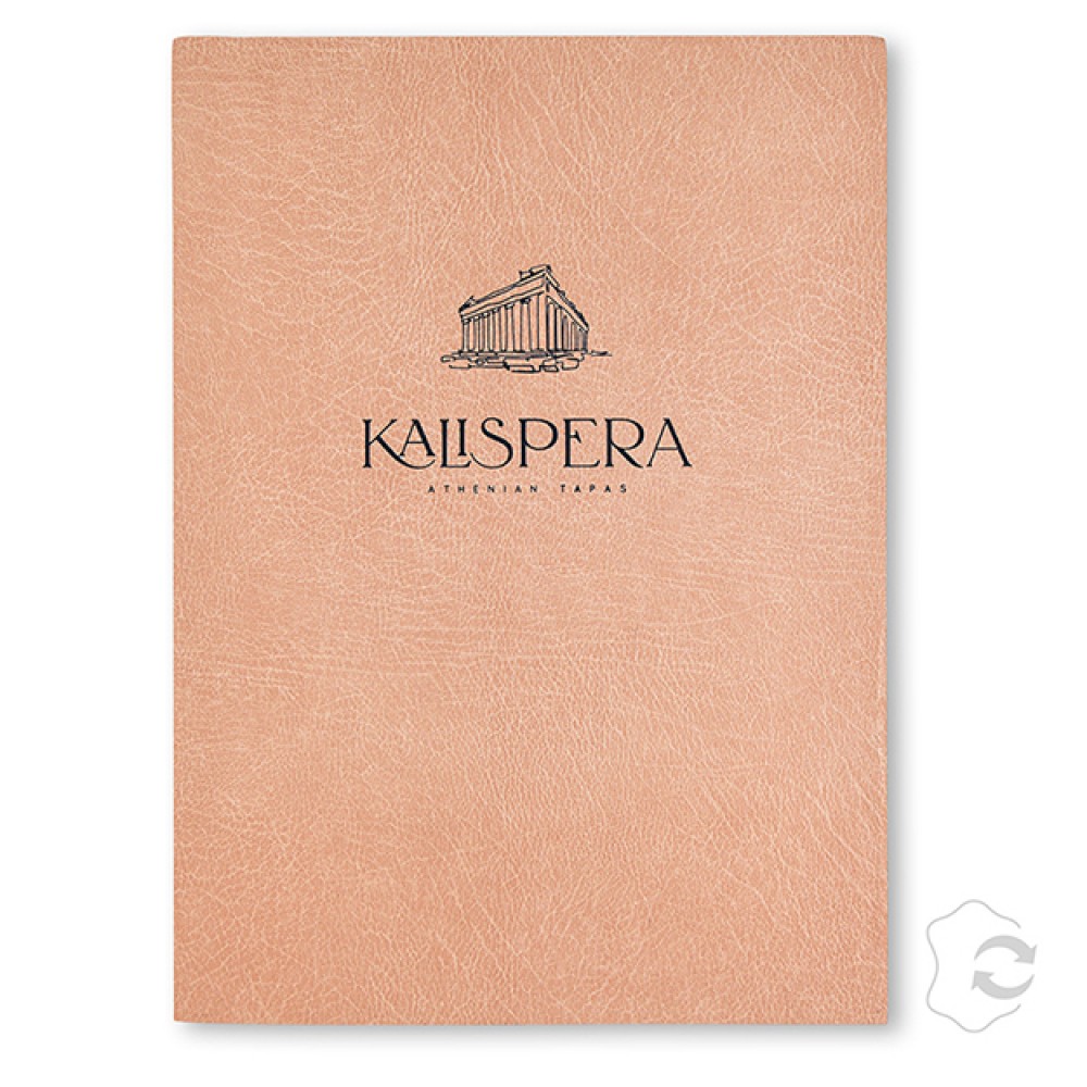 כיסוי תפריט Daily עשויה מ־100% עור ממוחזר, מיועדת לקטלוג של עמוד אחד.